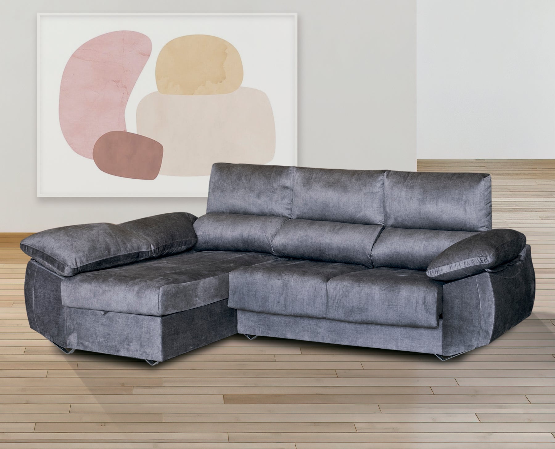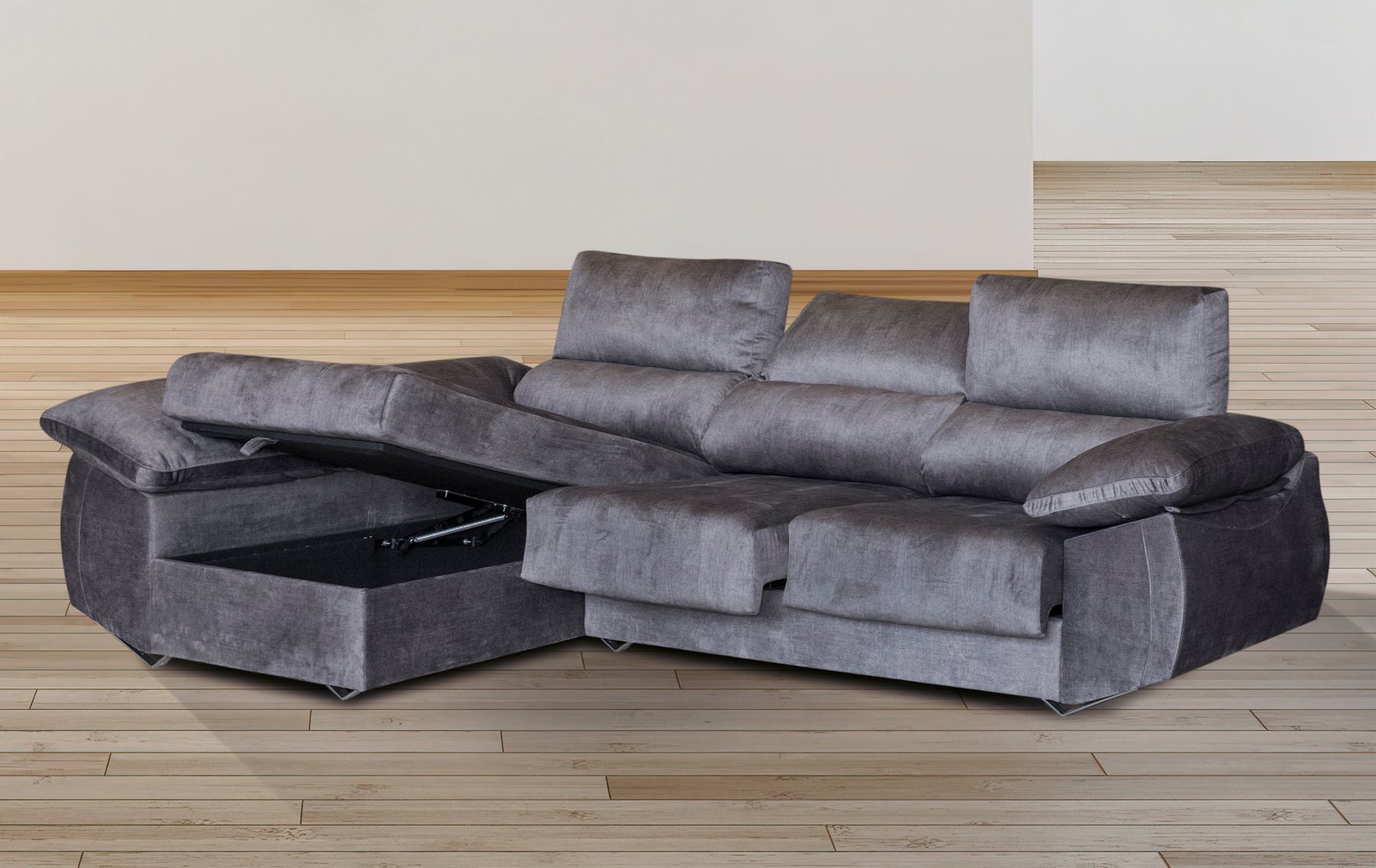 Pensado también para la vida real, cuenta con un arcón integrado en el módulo chaislongue, ideal para mantener tu salón ordenado, y su tapizado en microfibra algodonada con tratamiento anti-líquidos protege tu sofá mientras disfrutas de él sin preocupaciones. Las patas metálicas delanteras de gaviota y traseras redondas combinan resistencia y un toque de diseño moderno que eleva cualquier espacio.