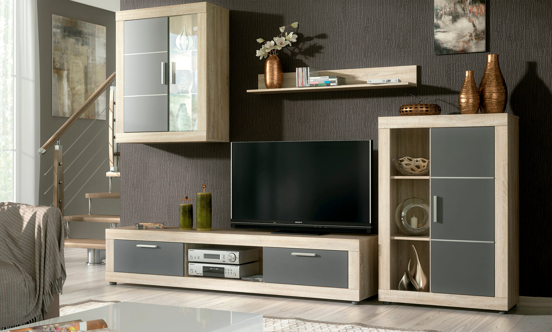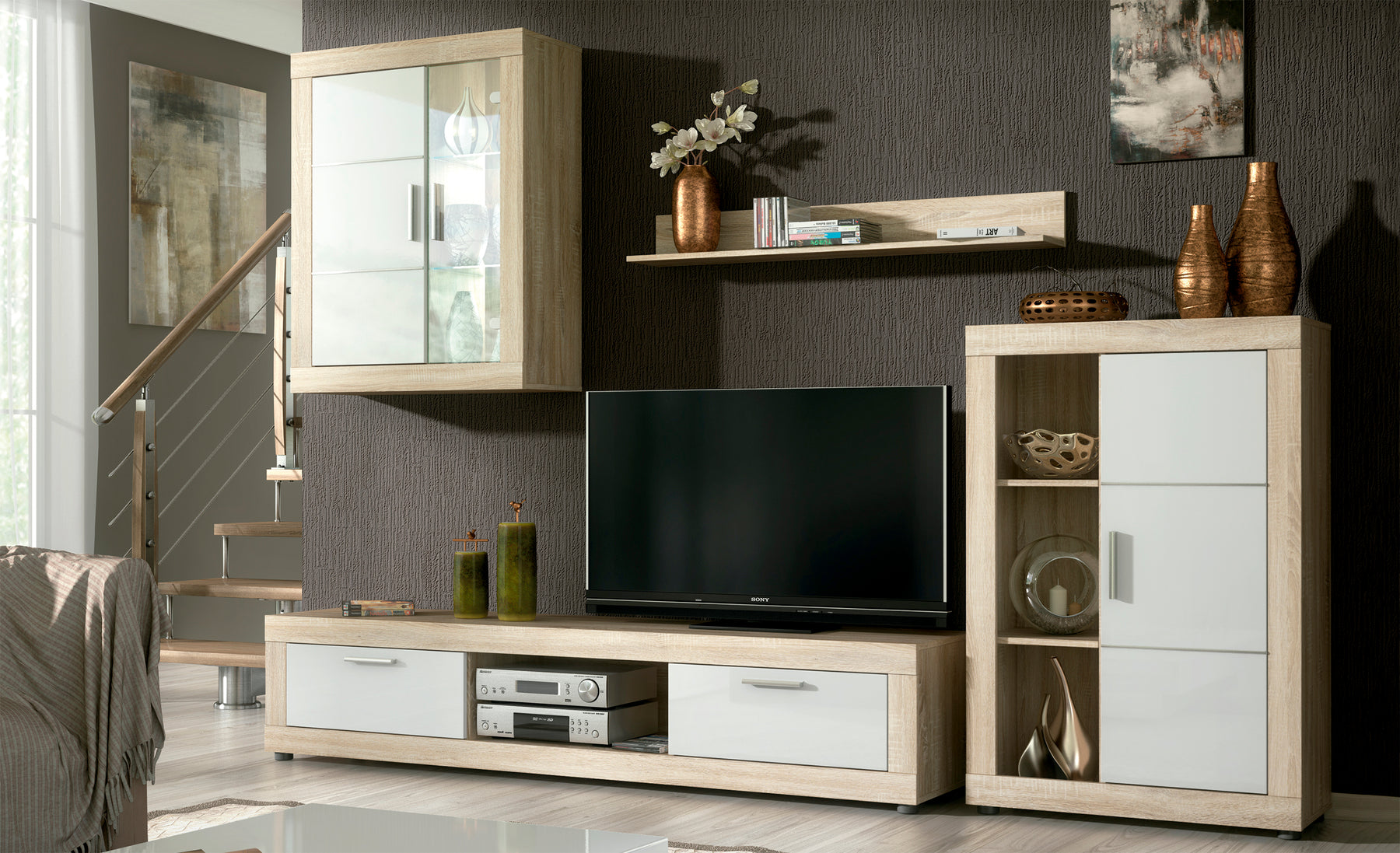 Con 259 cm de ancho, ofrece amplio espacio de almacenamiento y exhibición, ideal para libros, objetos decorativos o dispositivos multimedia. La iluminación LED integrada añade un efecto visual moderno, creando un ambiente acogedor y único en tu hogar.