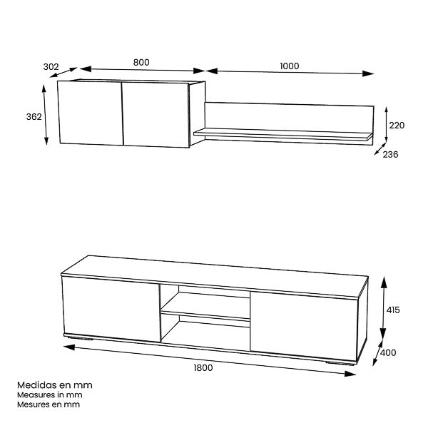 • Mueble bajo (2 puertas + huecos): 41,5 x 180 x 40 cm (alto x ancho x fondo)