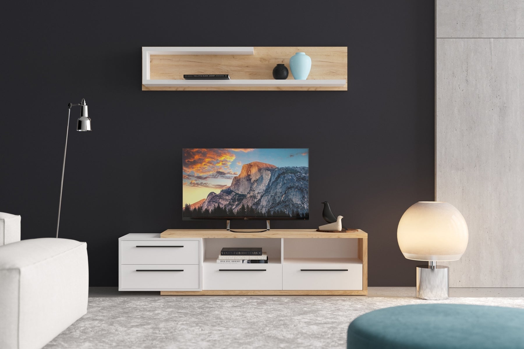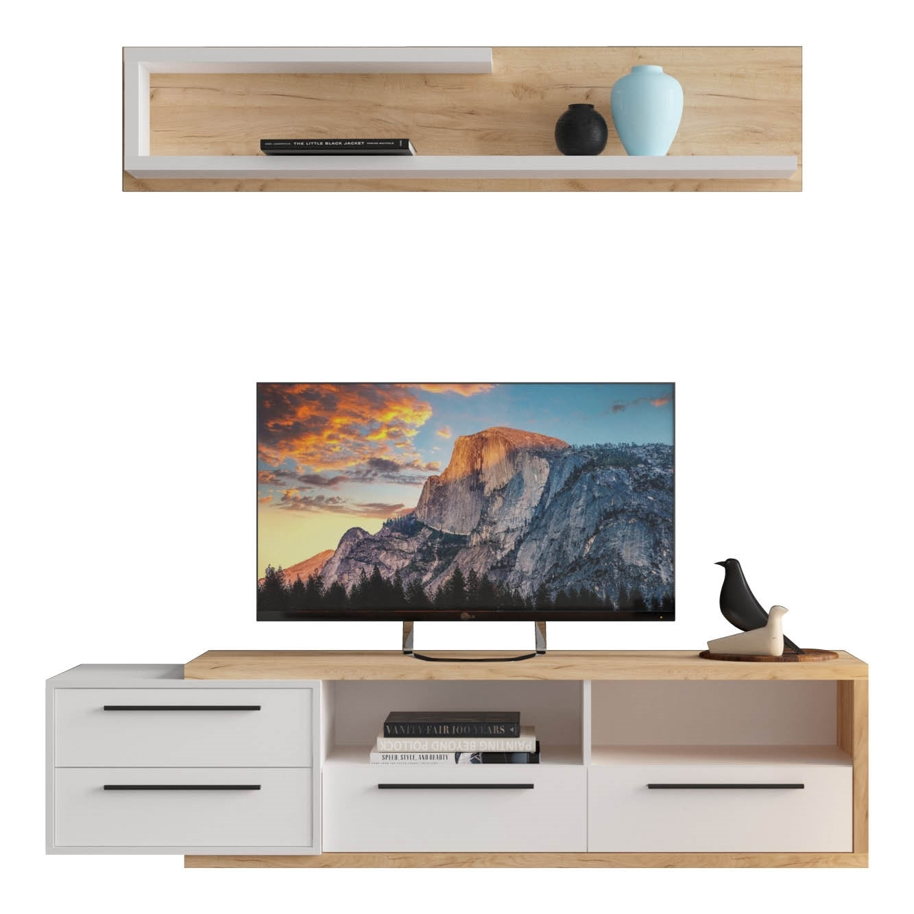 Está compuesto por un módulo TV amplio y un estante superior que maximizan el espacio disponible, permitiendo integrar tu televisor, dispositivos multimedia y objetos decorativos de forma organizada.