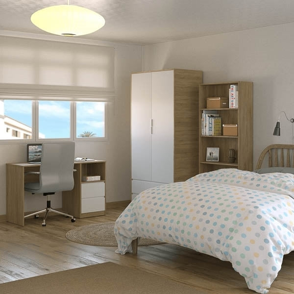 El Armario de 2 Puertas y 2 Cajones es la opción perfecta para quienes buscan orden, funcionalidad y diseño en su dormitorio. Su elegante combinación de roble cortez con blanco liso crea un contraste cálido y moderno que aporta luminosidad y sensación de amplitud a cualquier espacio.