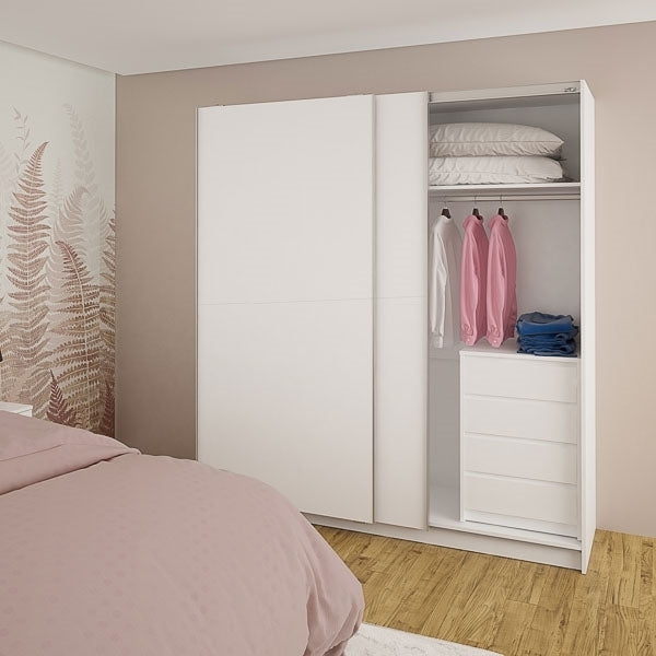 Su sistema de puertas correderas permite un acceso cómodo y fluido sin ocupar espacio adicional, lo que lo convierte en una opción ideal para habitaciones de cualquier tamaño. Además, el acabado texturizado en blanco poro aporta una sensación de calidez y elegancia, combinando a la perfección con estilos decorativos modernos, nórdicos o clásicos.