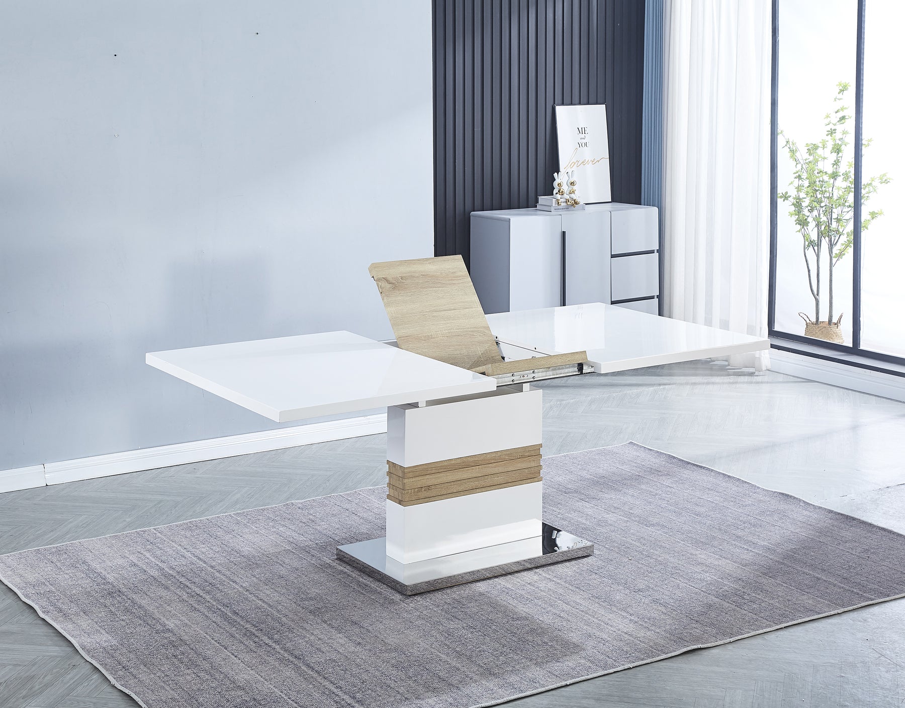 En MuebletÓN llevamos diseño, elegancia y funcionalidad a tu hogar 🏡. La mesa CARLOTA extensible combina un estilo moderno y sofisticado con materiales de alta calidad, perfecta para cenas familiares, reuniones con amigos o cualquier ocasión especial 🍽️. Su tapa de DM lacado blanco brillo con ala central forrada en color Cambrian aporta luminosidad y un toque de calidez, mientras que las patas y pieza central a juego refuerzan su diseño contemporáneo 💎. La base forrada en acero inoxidable añade resistencia y estabilidad, garantizando durabilidad.